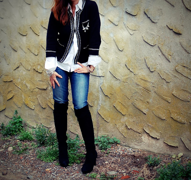 Shirt, Ralph Lauren; Jacket, White House, Black Market; Jeans, Paige; Boots, Via Spiga; Sunnies, Tom Ford; Bracelets, too many to name